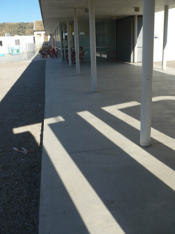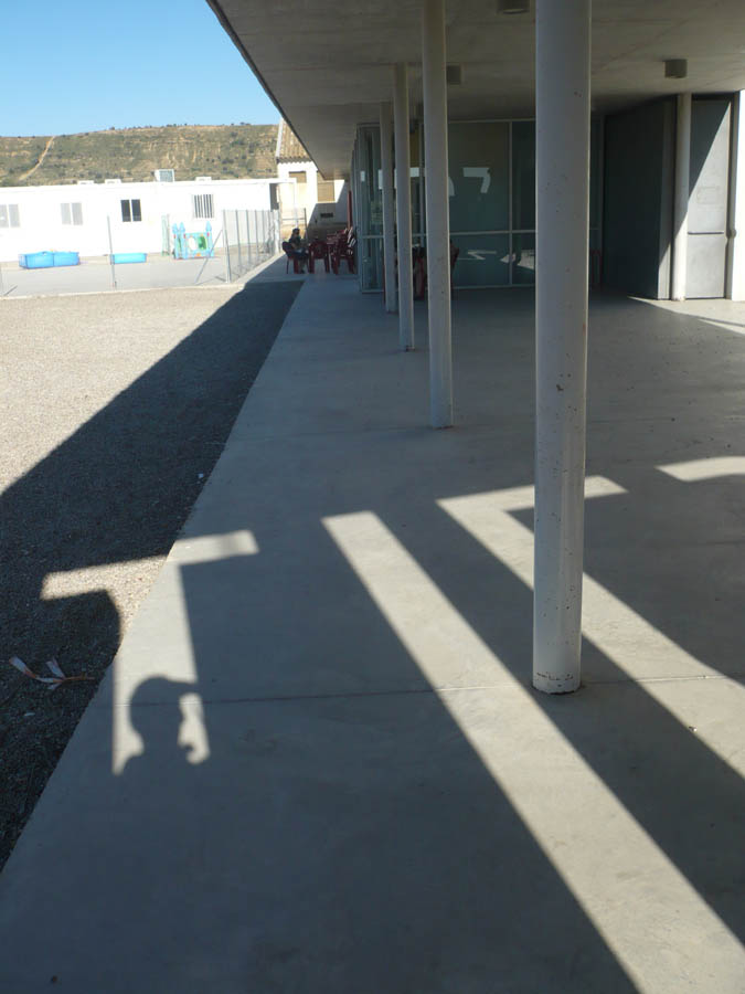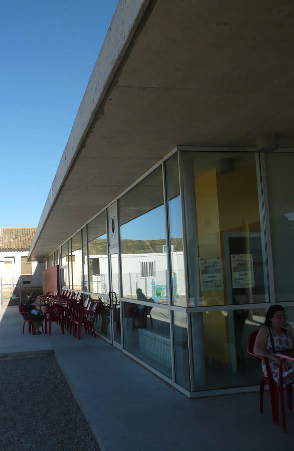 Esta zona de servicios se “estira” presentando fachada al espacio libre desalojado y a la carretera de acceso al municipio manifestando el carácter público de la construcción, su gran longitud contrasta con su escasa altura, que junto con voladizos y espacio de porche contribuyen a darle una escala “más humana” que nos invita a acercarnos a la cafetería o para atravesándola acceder al volumen del pabellón.